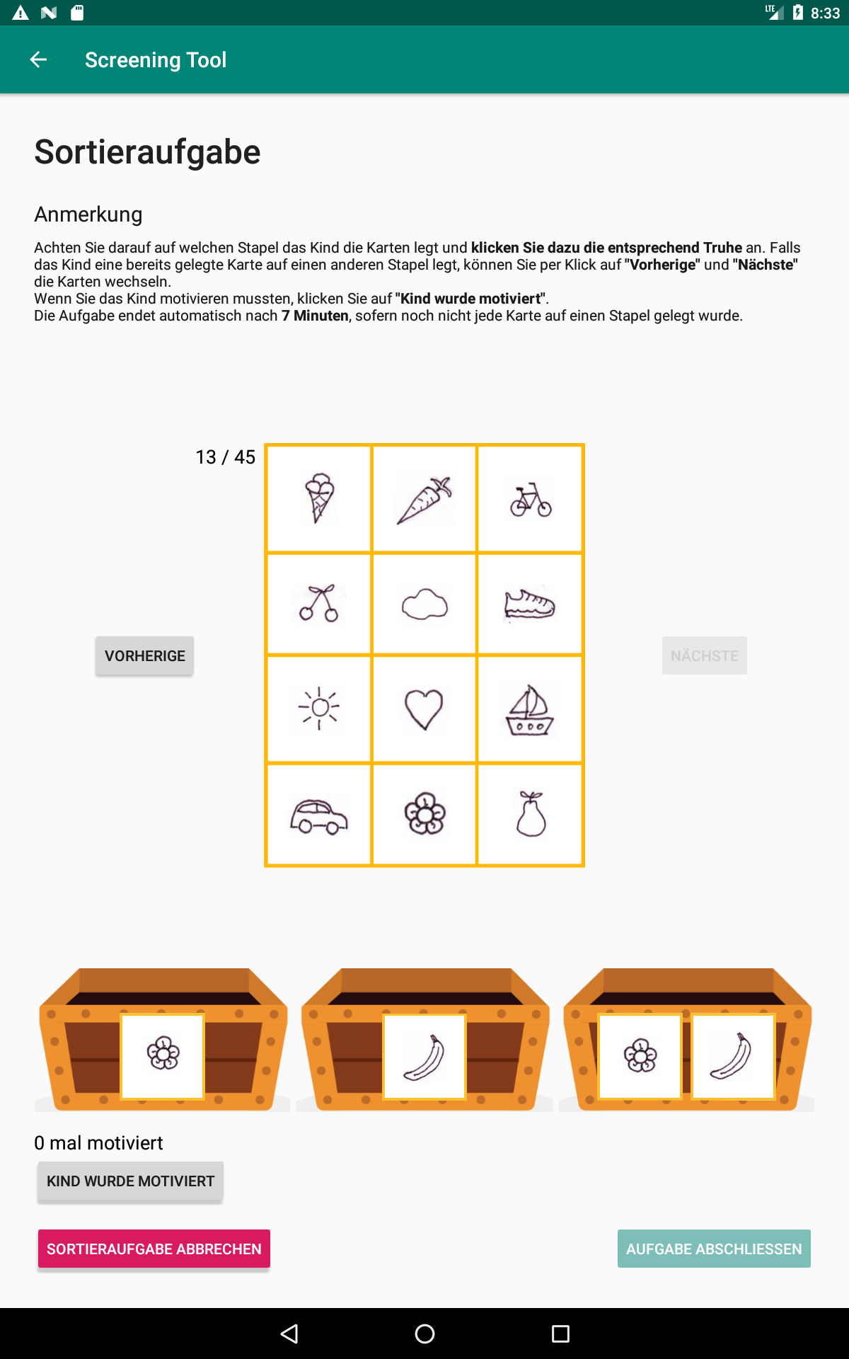 Das Ziel dieser Arbeit ist die Entwicklung des erwähnten digitalen Screenings, welches in dieser Arbeit als "School Start Screening Tool" bezeichnet wird, und dessen Infrastruktur, bestehend aus einer Webapplikation und einem Webserver. Das Hauptziel war herauszufinden, wie eine Tablet-Anwendung für Kinder im Vorschulalter ohne die erforderlichen Lese- und Rechtschreibfähigkeiten entwickelt werden kann und wie man diese Anwendung gestaltet, um Kinder über mehrere Minuten lang motiviert zu halten. Darüber hinaus mussten die von den Entwicklungspsychologen entwickelten Aufgaben ihren unterschiedlichen Anforderungen entsprechen und in eine interessante Rahmengeschichte für die Kinder eingebunden werden."